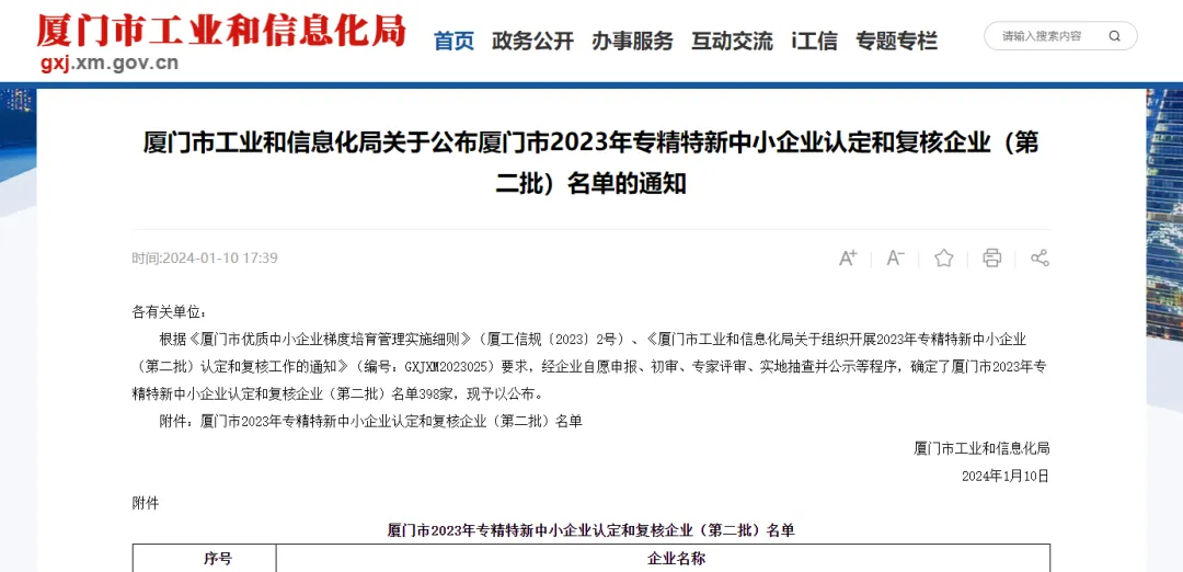 近日,廈門市工業(yè)和信息化局公布廈門市2023年專精特新中小企業(yè)認(rèn)定通過(guò)名單。廈門豪天科技有限公司(以下簡(jiǎn)稱“豪天”)榮獲廈門市“專精特新”中小企業(yè)認(rèn)定。