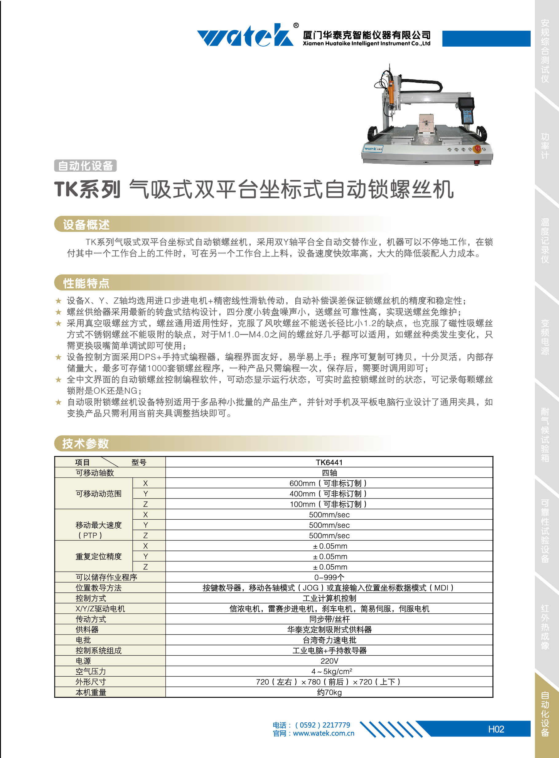 TK系列氣吸式雙平臺坐標式自動鎖螺絲機,采用雙Y軸平臺全自動交替作業(yè),機器可以不停地工作,在鎖付其中一個工作臺上的工件時,可在另一個工作臺上上料,設(shè)備速度快效率高,大大的降低裝配人力成本。