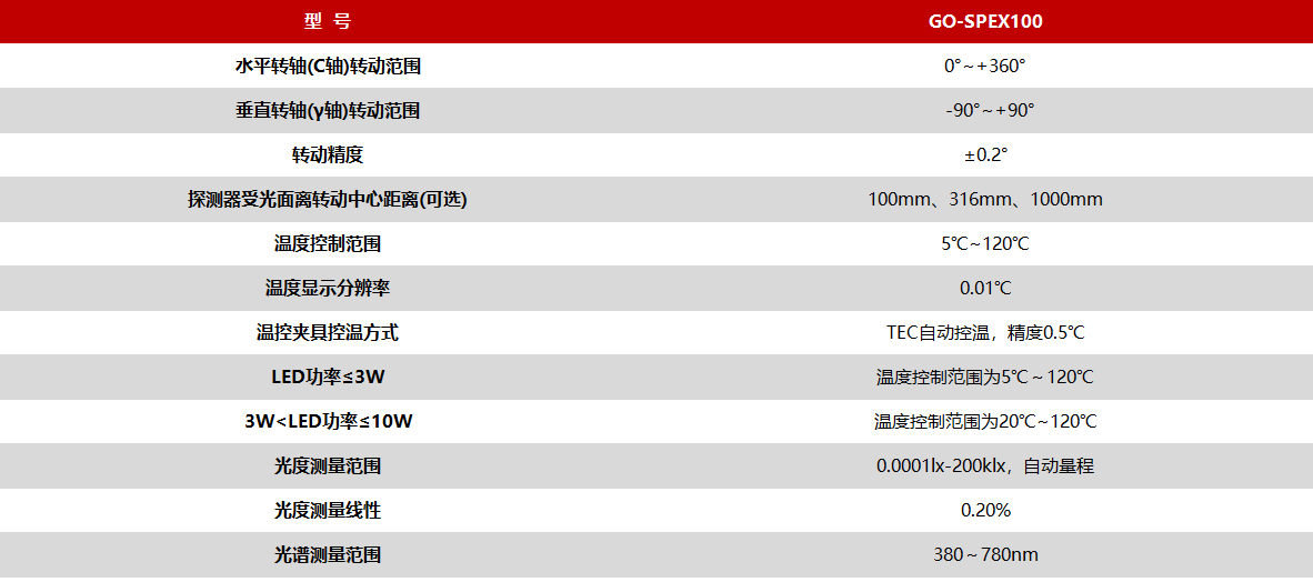 GO-SPEX100空間光譜分布測(cè)量?jī)x集合LED光、色、電綜合測(cè)試功能,且內(nèi)置精密溫控平臺(tái),可實(shí)現(xiàn)LED的精確控溫,不僅用于測(cè)量特定溫度下LED的光色參數(shù),還可以測(cè)量其光色性能隨溫度變化的特性。測(cè)試參數(shù)包括:空間光強(qiáng)分布曲線、光通量、空間光譜分布、相對(duì)光譜、絕對(duì)光譜、顏色參數(shù)、正向電流和正向電壓等。