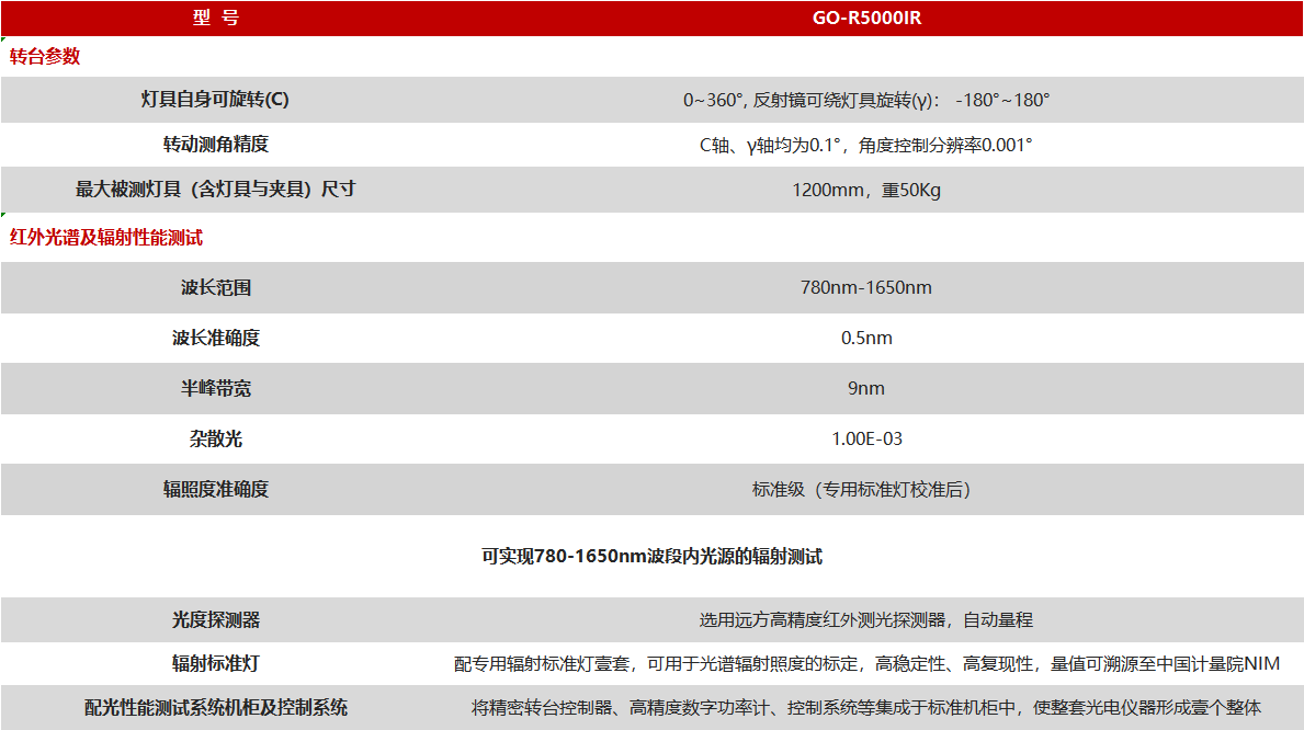 用于各種紅外光源及燈具的總輻射通量的高精度測試;測量各種尺寸光源和燈具的最高精度紅外總輻射通量測量方法,符合CIE技術(shù)文件的推薦。實現(xiàn)各種紅外LED模組或紅外光源(被測光源在特定尺寸范圍內(nèi))的空間輻射強(qiáng)度分布(配光曲線)的高精度測試。