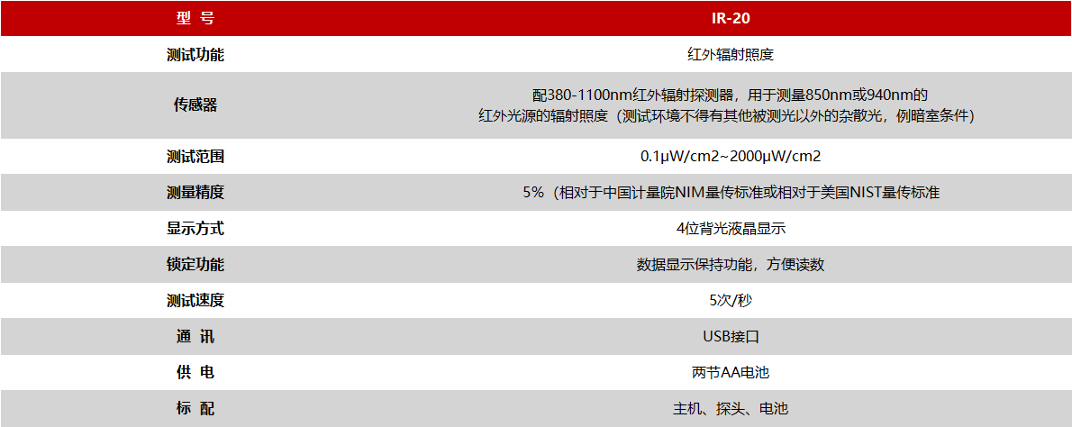 IR-20紅外輻射照度計是一種精度高、測量范圍廣、體積小、功耗低、性能穩(wěn)定、便于攜帶的袖珍型手持式紅外輻射照度計。