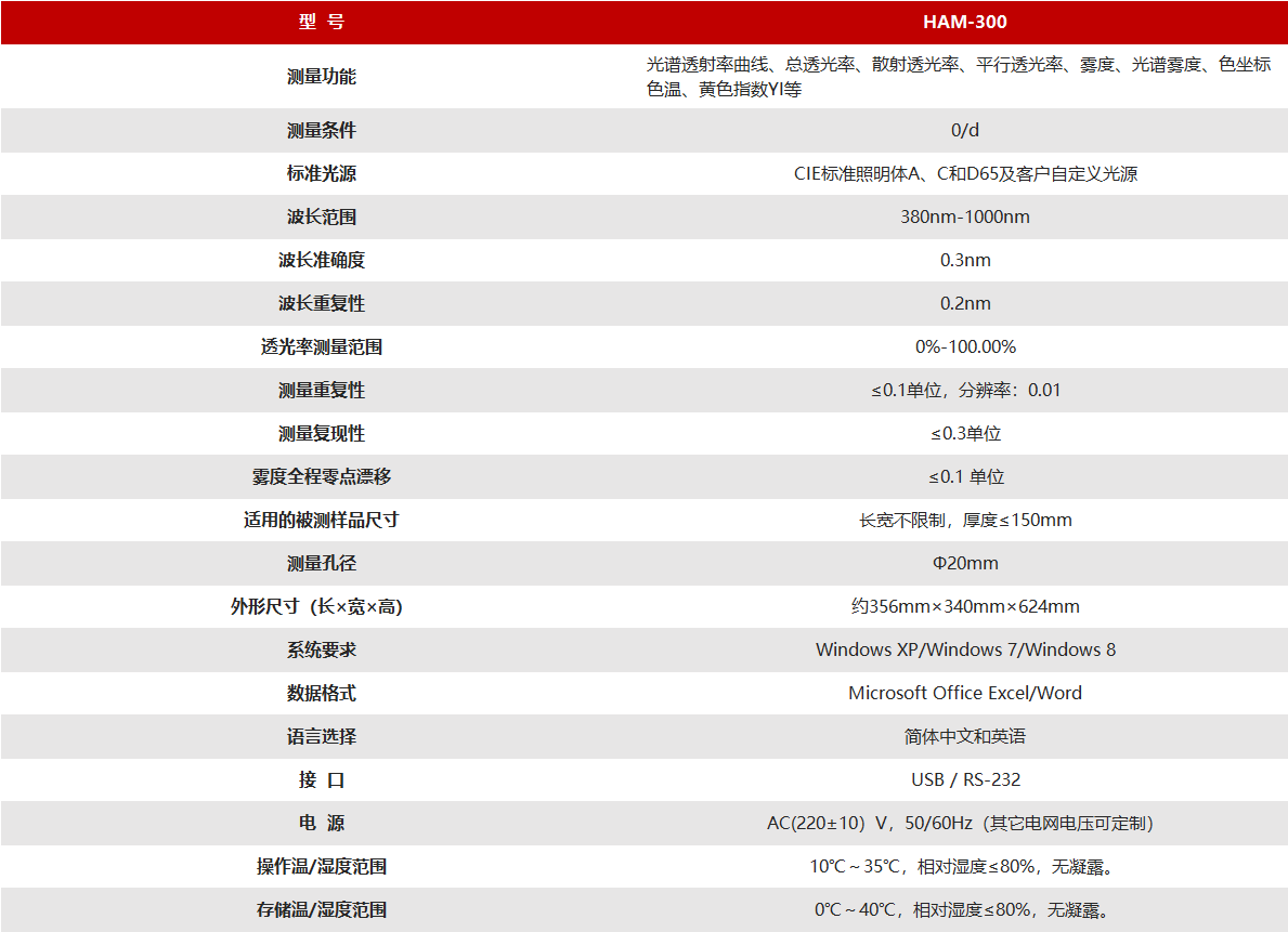 HAM-300主要用于玻璃蓋板、光學(xué)膜等材料不同波長下的光譜透光率、霧度以及材料在特定光源下光色性能測試,解決AG,AR玻璃以及光學(xué)薄膜等樣品的性能評價,依據(jù)ASTM D1003,GB/T 2410,ISO14782、JIS K7136、JC/T2130-2013,JIS K7105-81等標準的要求,系統(tǒng)已被業(yè)內(nèi)眾多企業(yè)所采用。