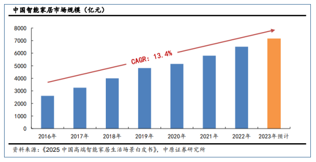 我國智能家居行業(yè)同樣發(fā)展迅速,2016—2022 年市場規(guī)模由 2608 億元增長到 6515 億元, CAGR 達(dá)到 16.5%,預(yù)計(jì) 2023 年市場整體規(guī)模將達(dá)到約 7150 億元。