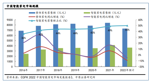 從智能家居產(chǎn)品拆分來看,智能家電占比最大約為 20%,對比其他安防系列與家居配件產(chǎn) 品份額優(yōu)勢明顯。盡管受到前期疫情及其他宏觀因素?cái)_動影響,智能家電行業(yè)增速有所放緩, 但對比整體家電行業(yè)的銷售額占比仍持續(xù)保持著提升態(tài)勢。