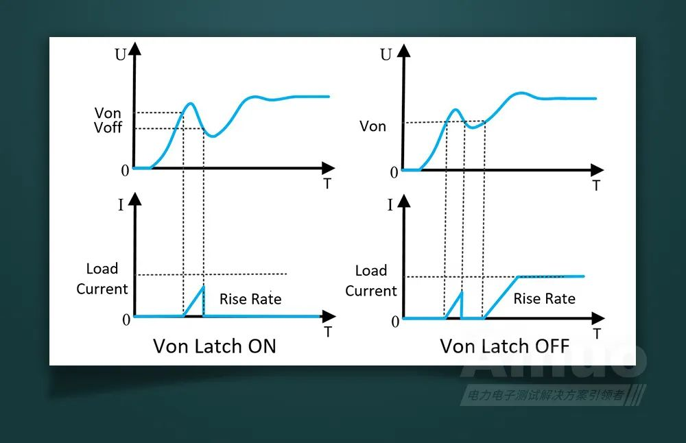 如上所述,其中工況5為測(cè)試最嚴(yán)苛工況。繼電器閉合瞬間,經(jīng)常會(huì)出現(xiàn)CR/CP帶載模式時(shí)炸機(jī),從而損壞電子負(fù)載或者電源。為了適應(yīng)這類使用工況,艾諾電子負(fù)載設(shè)計(jì)了Von Latch功能,設(shè)置拉載門檻電壓,當(dāng)電壓高于Von值后,負(fù)載開始起載,使繼電器幾百萬次開合試驗(yàn)都正常使用。