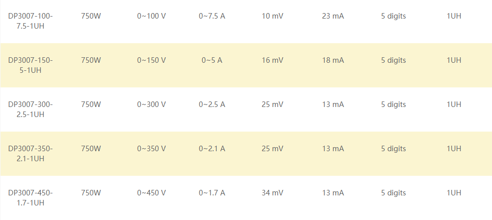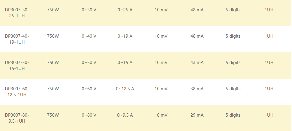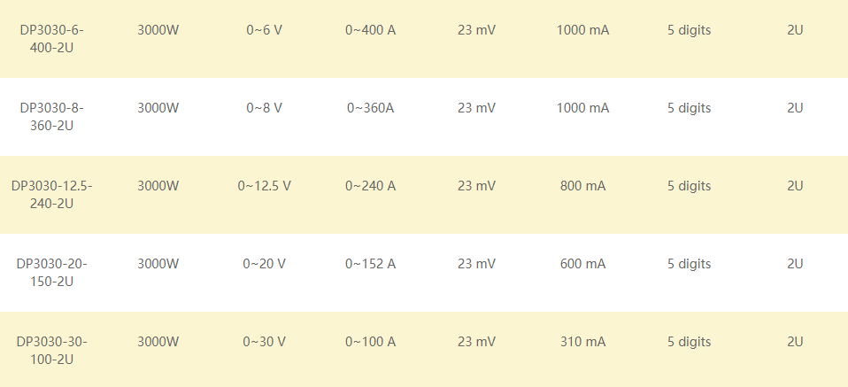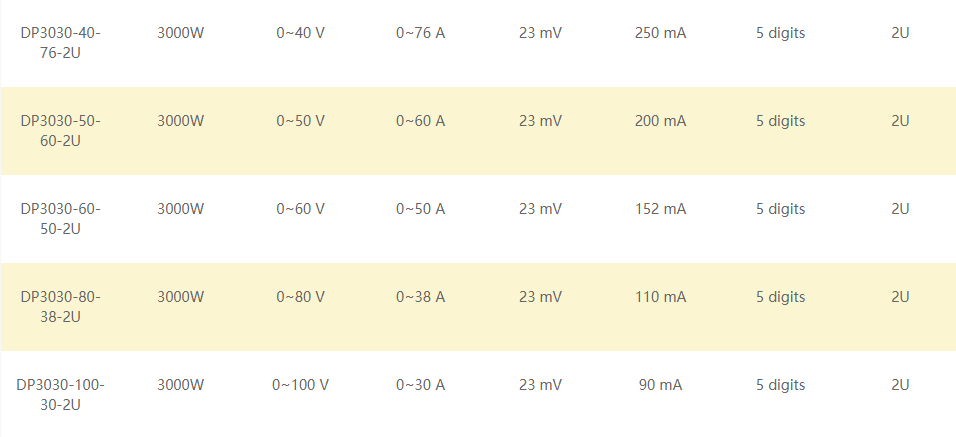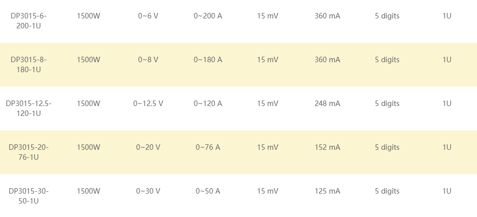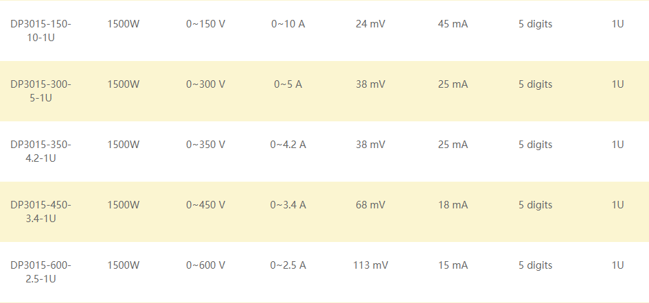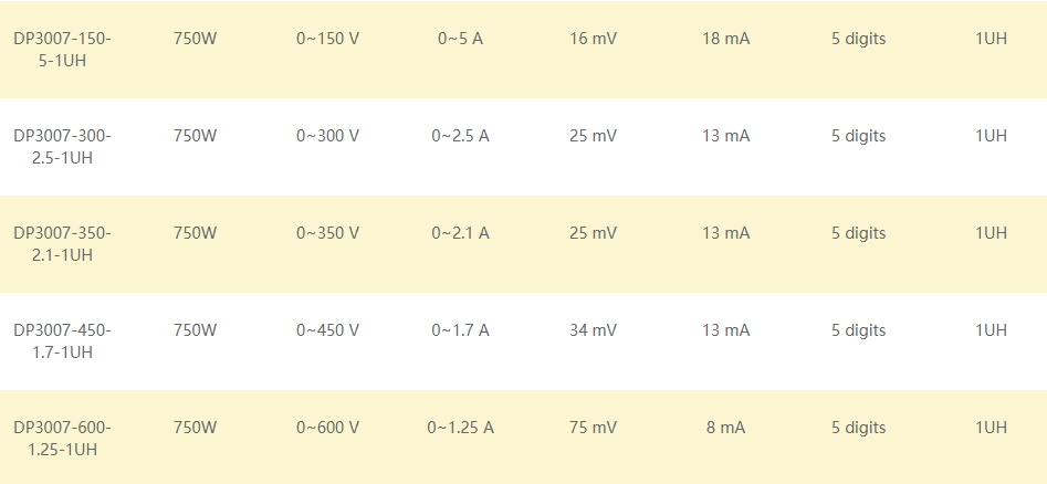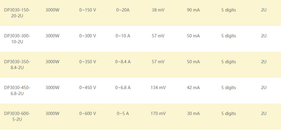 DP3000提供多種型號(hào)參數(shù)可選(750/1500/3000W每種15個(gè)不同電壓/電流型號(hào)),滿(mǎn)足不同的電壓/電流需求場(chǎng)合。