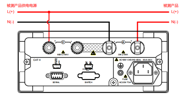 電壓表直接測量供電電壓,其兩端跨接于被測產(chǎn)品和電流表兩端,存在電流表內(nèi)阻分壓測量誤差。