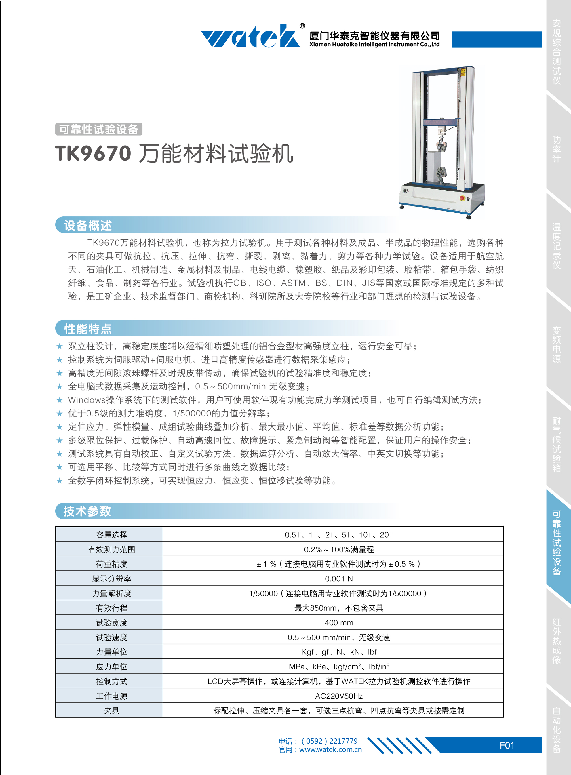 TK9670萬能材料試驗機,也稱為拉力試驗機。用于測試各種材料及成品、半成品的物理性能,選購各種不同的夾具可做抗拉、抗壓、拉伸、抗彎、撕裂、剝離、黏著力、剪力等各種力學試驗。設備適用于航空航天、石油化工、機械制造、金屬材料及制品、電線電纜、橡塑膠、紙品及彩印包裝、膠粘帶、箱包手袋、紡織纖維、食品、制藥等各行業(yè)。試驗機執(zhí)行GB、ISO、ASTM、BS、DIN、JIS等國家或國際標準規(guī)定的多種試驗,是工礦企業(yè)、技術監(jiān)督部門、商檢機構、科研院所及大專院校等行業(yè)和部門理想的檢測與試驗設備。