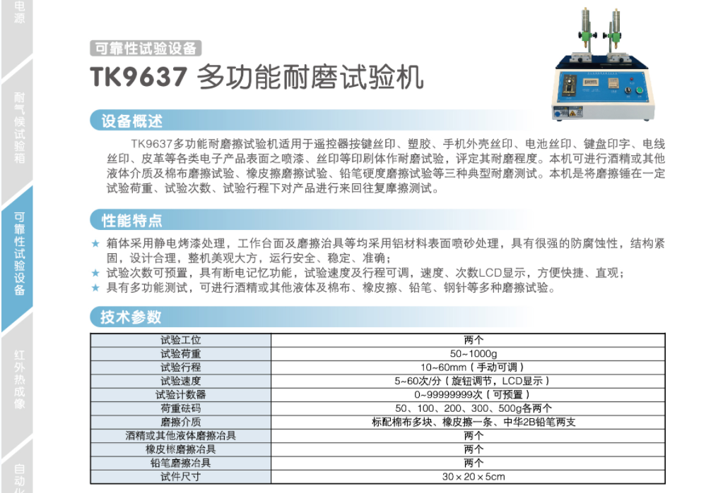適用于遙控器按鍵絲印、塑膠、手機外殼絲印、電池絲印、鍵盤印字、電線絲印、皮革等各類電子產(chǎn)品表面之噴漆、絲印等印刷體作耐磨試驗,評定其耐磨程度。本機可進行酒精或其他液體介質(zhì)及棉布磨擦試驗、橡皮擦磨擦試驗、鉛筆硬度磨擦試驗等三種典型耐磨測試。本機是將磨擦錘在一定試驗荷重、試驗次數(shù)、試驗行程下對產(chǎn)品進行來回往復摩擦測試。