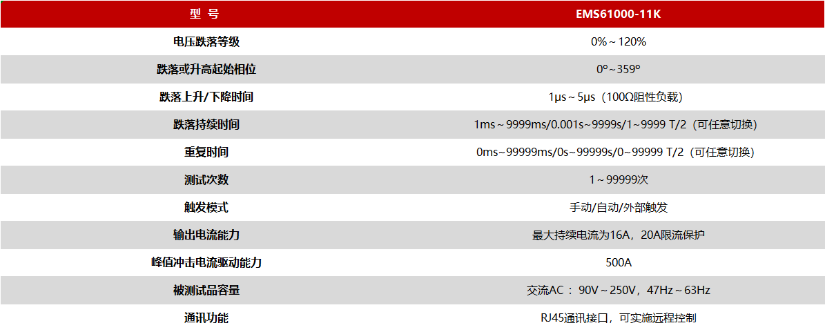 模擬電網(wǎng)、電力設施的故障(例如短路)或負荷出現(xiàn)大的變化引起的對受試設備的影響。具有跌落電壓等級范圍寬、跌落起始相位可任意設定等優(yōu)點。適用于照明電器、電子線路和設備的周波跌落抗擾度測試。