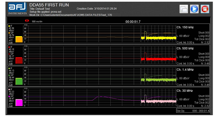 同時執(zhí)行峰值及準峰值測試,自動計算喀嚦聲數(shù)(短,長,連續(xù)噪聲干擾,及切換動作等);自動加權(quán)、自動判斷測量結(jié)果。