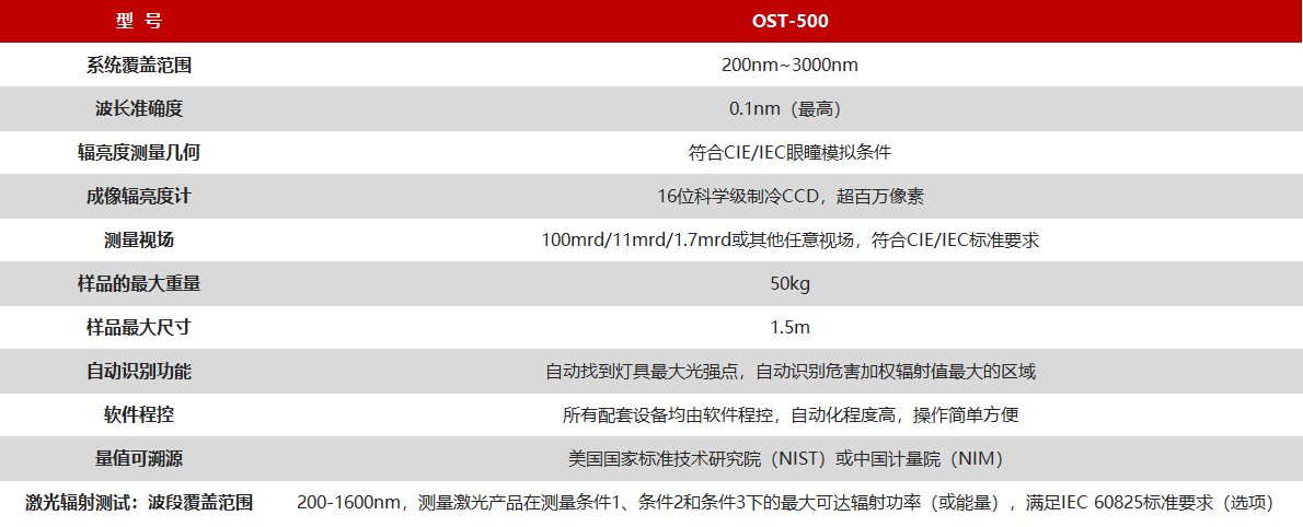 OST-500為200-3000nm全波段范圍光輻射安全測試系統(tǒng),參考IEC/EN 62471/CIE S009,IEC/TR 62778,GB7000.1-2015,GB/T 20145,IEC/EN 60598 Annex P.,IEC/EN 60432,IEC/EN 60335,GB/T34075-2017,GB/T34034-2017,2009/125/EC歐盟指令等相關(guān)標(biāo)準(zhǔn)。系統(tǒng)配備精密自動雙軸轉(zhuǎn)臺,可自動尋找和獲取最大輻射位置,并在最大輻射位置自動測量各種燈和燈系統(tǒng)(LED產(chǎn)品、紫外燈、照明光源和燈具等)的光生物危害值,進(jìn)行安全等級分類。