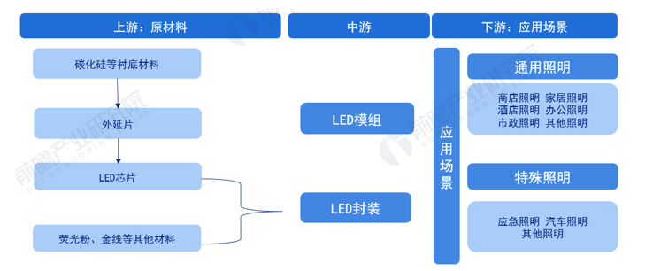 LED照明產業(yè)鏈上游包括外延片、LED芯片等環(huán)節(jié);中游主要是LED封裝環(huán)節(jié),LED封裝流程包括擴晶、固晶、引線與注膠等;下游為應用場景,使用場景包括家居、工業(yè)、酒店、汽車等。